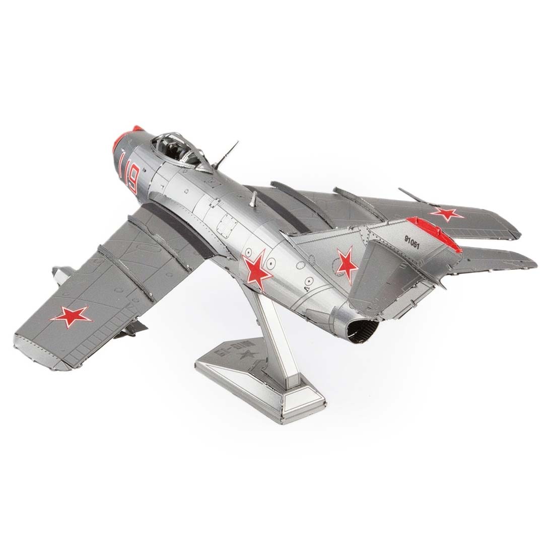 Das Modell MIG-15 von Metal Earth besteht aus 3 Metallbögen (11 x 11 cm) und ist aufgebaut 15,2 x 14,6 x 7 cm groß. Die MiG-15 ist ein einsitziges, einstrahliges sowjetisches Jagdflugzeug, das von dem russischen Luft- und Raumfahrt- sowie Rüstungsunternehmen Mikojan-Gurewitsch (MiG) gebaut wurde. Sie wurde während des Koreakriegs (195053) umfangreich im Kampf eingesetzt. Als sie erstmals im Koreakrieg eingeführt wurde, waren die Vereinigten Staaten schockiert von der Geschwindigkeit, der Steigfähigkeit und der hohen Einsatzhöhe des Flugzeugs. Als Reaktion darauf beeilten sich die USA, das neue F-86 Sabre-Jagdflugzeug einzuführen, um die amerikanische Luftherrschaft im Krieg wiederherzustellen.