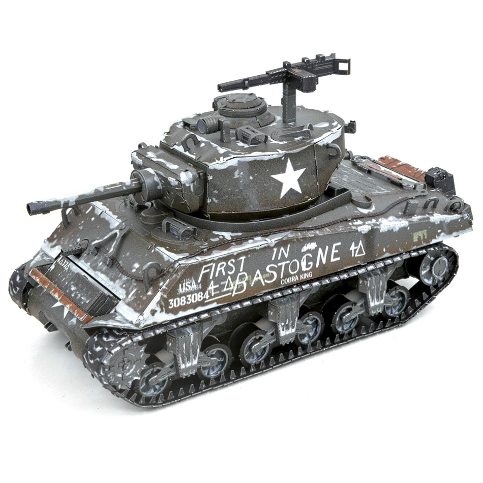 Der Bausatz aus der Premium Series M4 Sherman Tank von Metal Earth besteht aus 3,25 Metallbögen (10 x 20 cm) und ist 11,9 x 5,6 x 6,4 cm groß. Der M4 Sherman war der Hauptkampfpanzer der Vereinigten Staaten im Zweiten Weltkrieg. Der Panzer wurde nach dem Unionsgeneral William Tecumseh Sherman benannt. Die Produktion überstieg 50.000 Einheiten. Lediglich der sowjetische T-34 wurde im Zweiten Weltkrieg in noch größerer Stückzahl gebaut. Obwohl der Sherman dem schwerer bewaffneten deutschen Tiger I mit 56 Tonnen sowie dem Tiger II mit 72 Tonnen völlig unterlegen war, konnten seine Beweglichkeit, mechanische Zuverlässigkeit und die schiere Anzahl diese Nachteile strategisch ausgleichen.